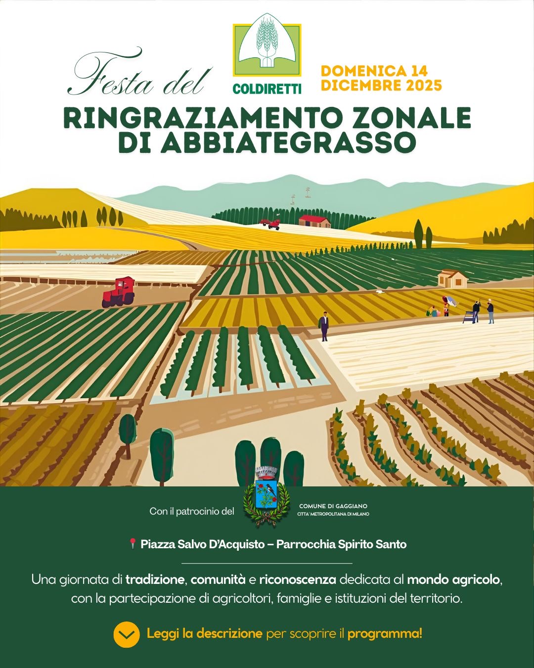 Domenica 14 dicembre 2025, il Comune di Gaggiano ospita la Festa del Ringraziamento Zonale di Abbiategrasso, promossa da Coldiretti.