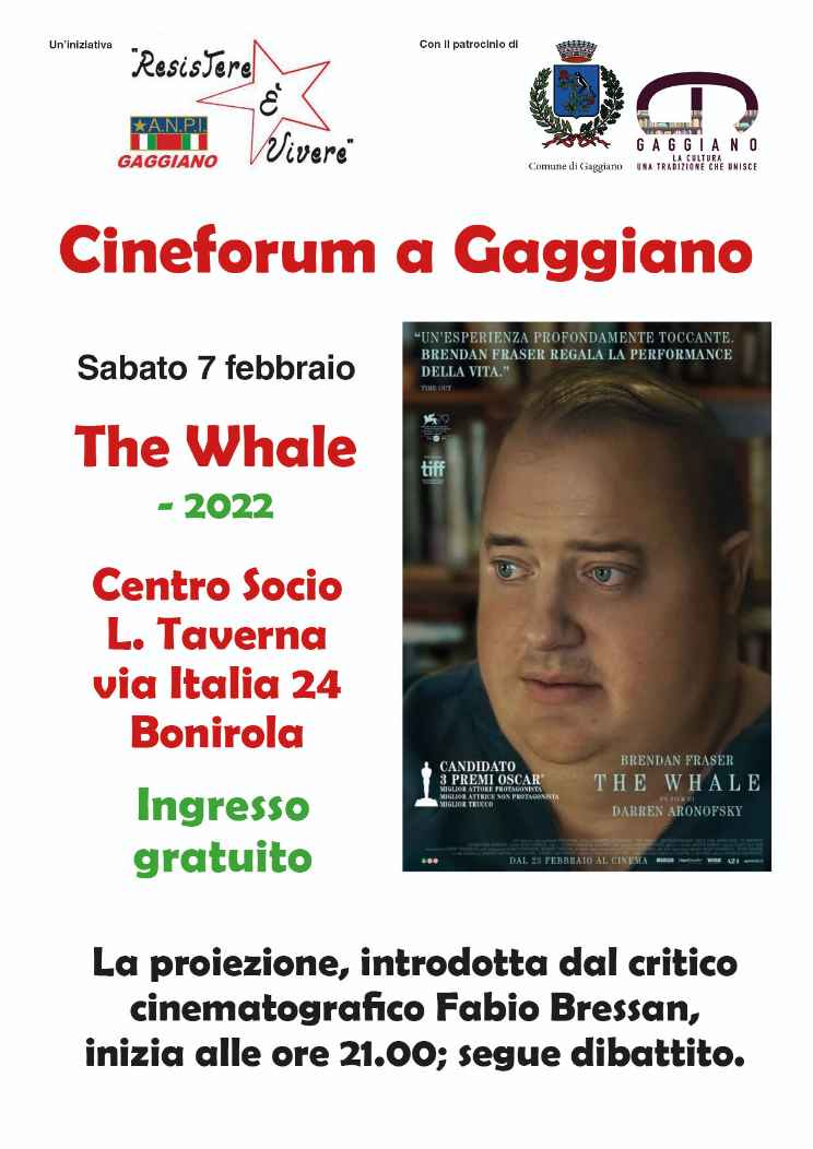 Sabato 7 febbraio alle ore 21.00 cineforum "The Whale - 2022" organizzato da A.N.P.I. Gaggiano con il patrocinio del Comune di Gaggiano.